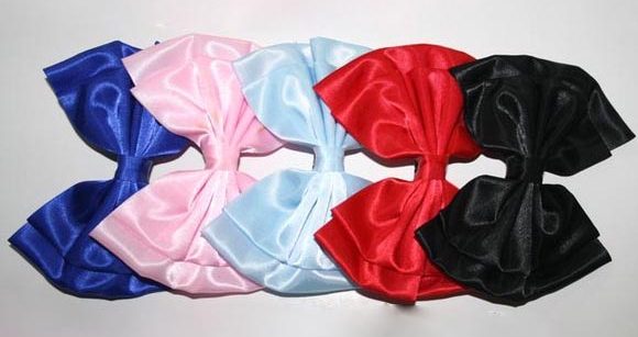 Double Satin Bow Barrette measures 5 1/2″ long and 4″ wide at widest point. A French Clasp barrette is attached to the back of the bow.